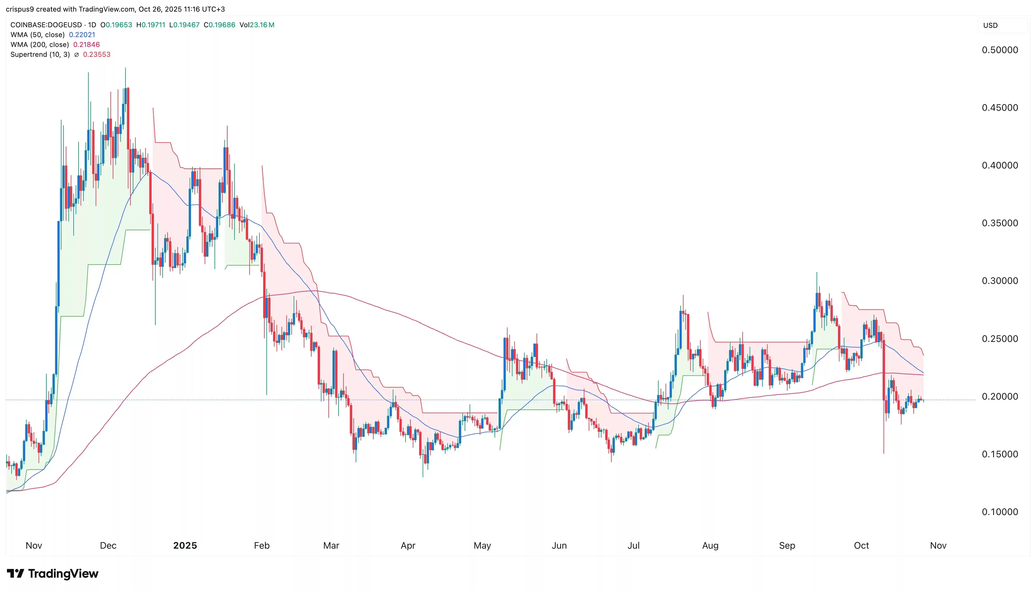 قیمت دوجکوین همچنان زیر شاخص سوپرتراند (Supertrend) قرار دارد، که نشان میدهد فشار فروش در بازار غالب است. بنابراین، محتملترین سناریو، شکست نزولی قوی است که میتواند تا کف ماه جاری در سطح ۰.۱۴۹۳ دلار کاهش یابد، که حدود ۲۵ درصد پایینتر از قیمت فعلی است.