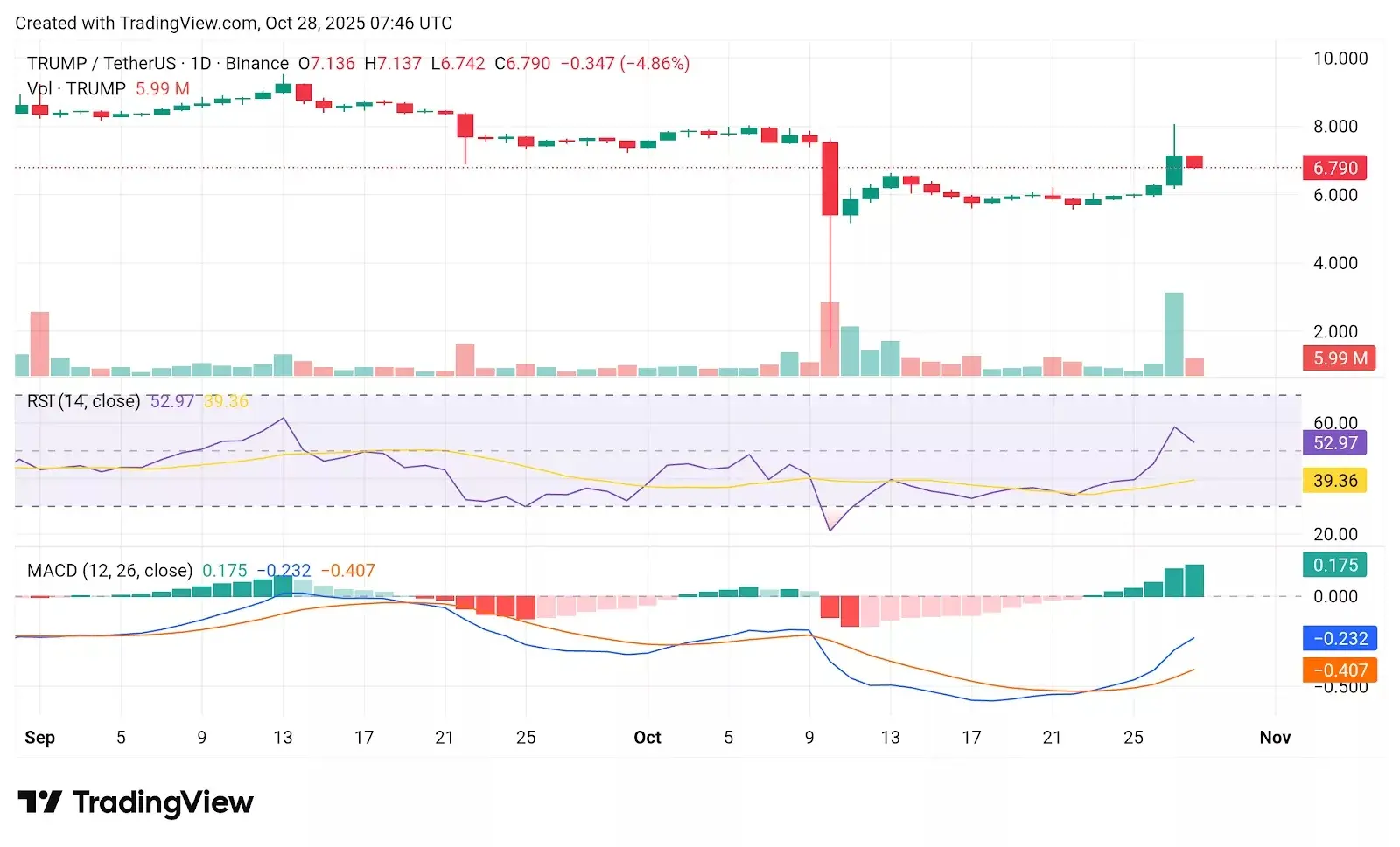 قیمت TRUMP (ترامپ) در مدت اخیر در محدوده تقریباً ثابتی حول سطح 6 دلار نوسان داشته است. با این حال، در تاریخ 27 اکتبر، یک جهش قابل توجه رخ داد که باعث شد این آلتکوین نزدیک به مرز 8 دلار صعود کند. هرچند پس از آن، قیمت کمی اصلاح شد، اما حمایت خود را بالای سطح 6.50 دلار حفظ کرده است.