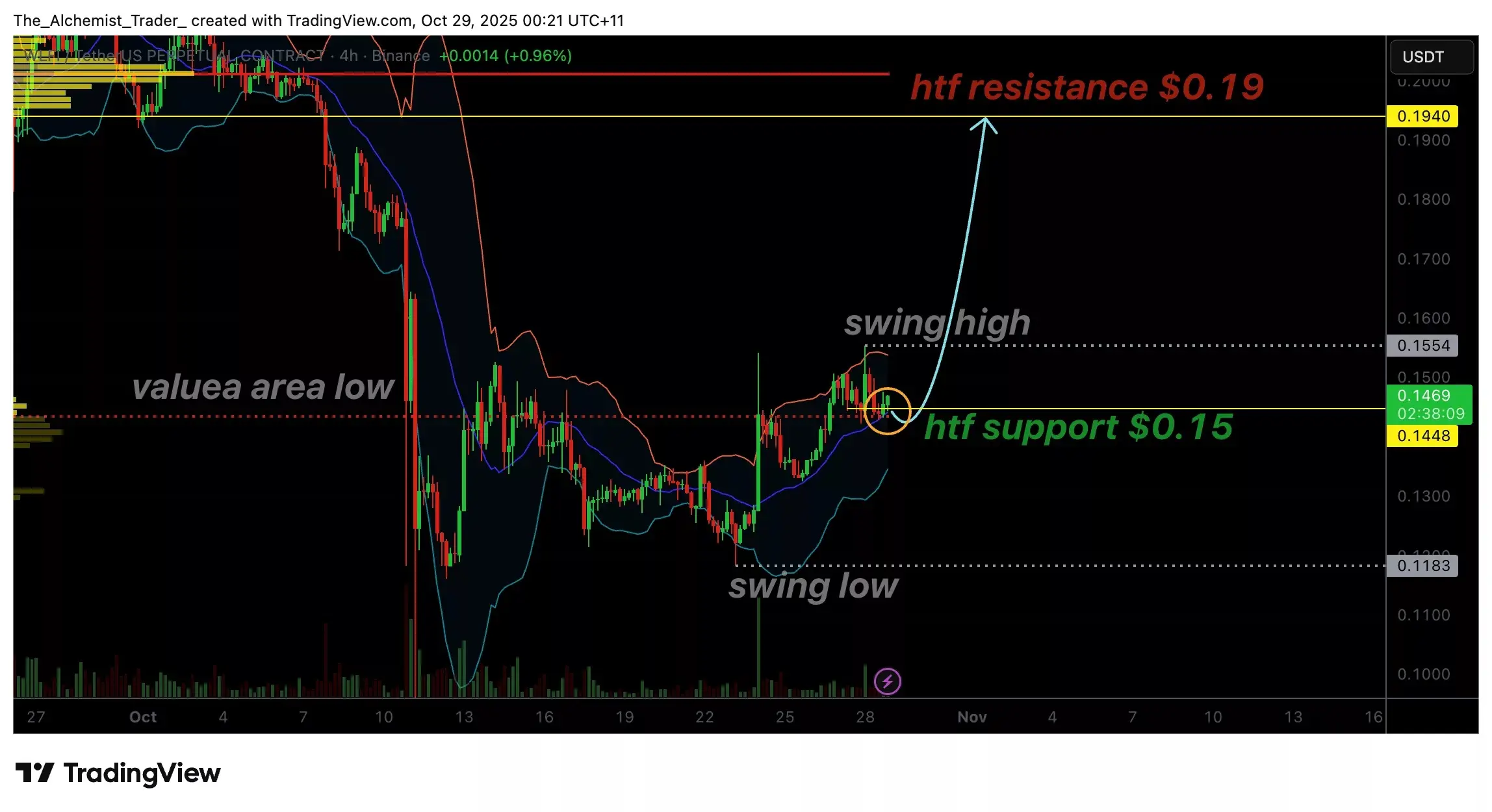 در حال حاضر، بازار در فاز جمعآوری عرضه قرار دارد و قیمت در محدوده پایینترین سطح منطقه ارزش (value area low) که حدود ۰.۱۴ تا ۰.۱۵ دلار است، تثبیت شده است. این سطح به عنوان یکی از نقاط حمایت قدرتمند در گذشته عمل کرده و پایهای برای روندهای صعودی قبلی بوده است.