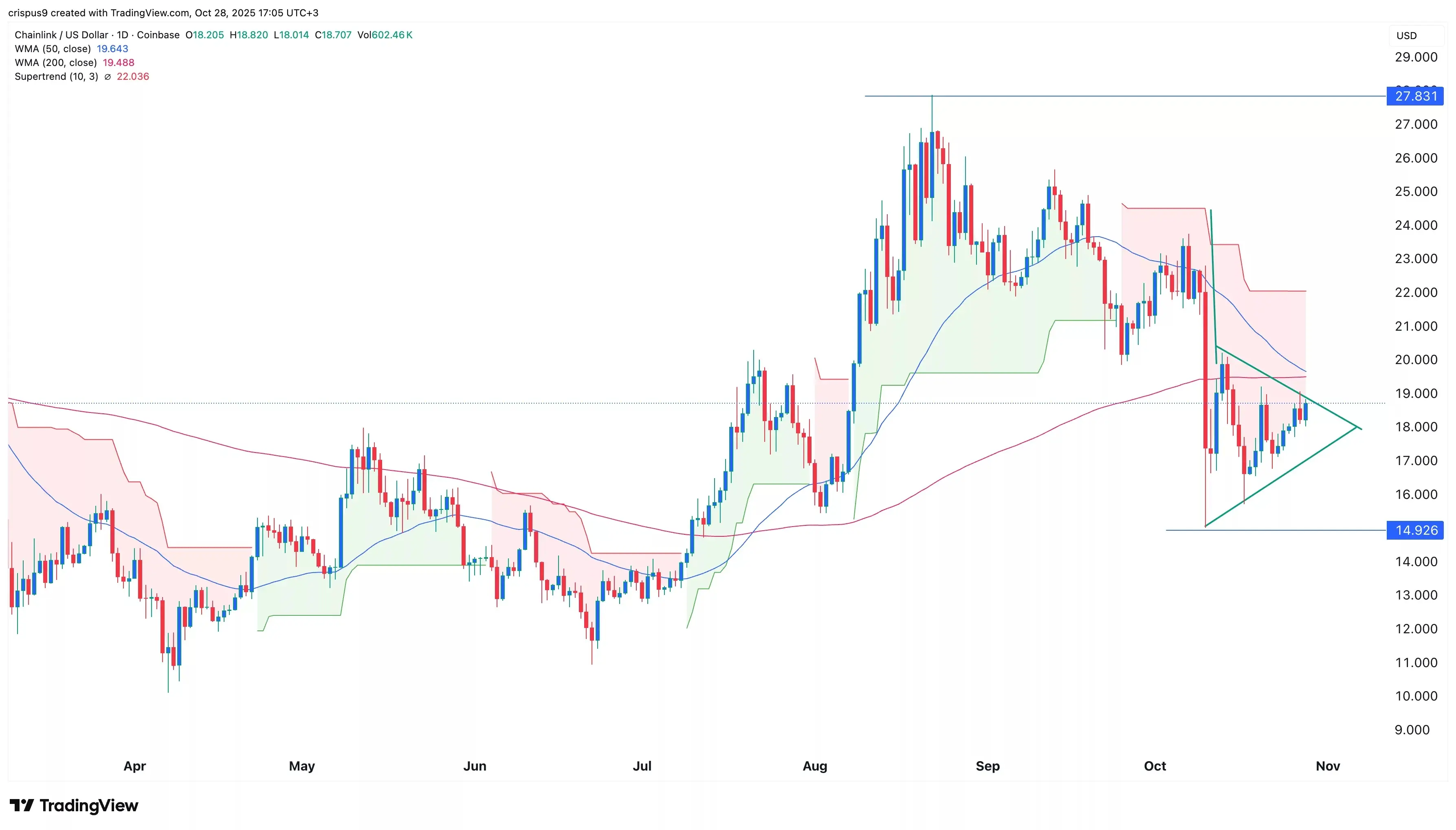 نمودار تایمفریم روزانه نشان میدهد که قیمت لینک (Chainlink) از اوج سال جاری در حدود ۲۷.۸۳ دلار در سپتامبر، به سطح کنونی ۱۸.۷۴ دلار کاهش یافته است. در حال حاضر، این دارایی در حال شکلگیری الگوی پرچم نزولی است که از ترکیب خط عمودی و مثلث متقارن تشکیل شده و شباهت به پرچم برعکس دارد.