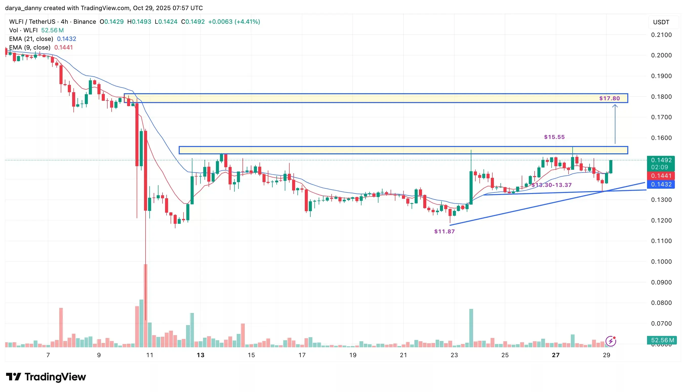 در تحلیل روند قیمتی، پس از ریزش ناگهانی در ۱۰ اکتبر، WLFI توانسته است پایینترین سطح خود را در ۱۱.۸۷ دلار ثبت کند و سپس با ثبت سطح بالاتر در ۱۳.۳۰ دلار، تلاش برای بازیابی آغاز شود. هرچند روند صعودی اولیه با شکلگیری یک کف تقریبا همسطح در ۱۳.۳۷ دلار کمی تضعیف شد، اما تصویر کلی بازار همچنان مثبت است.
