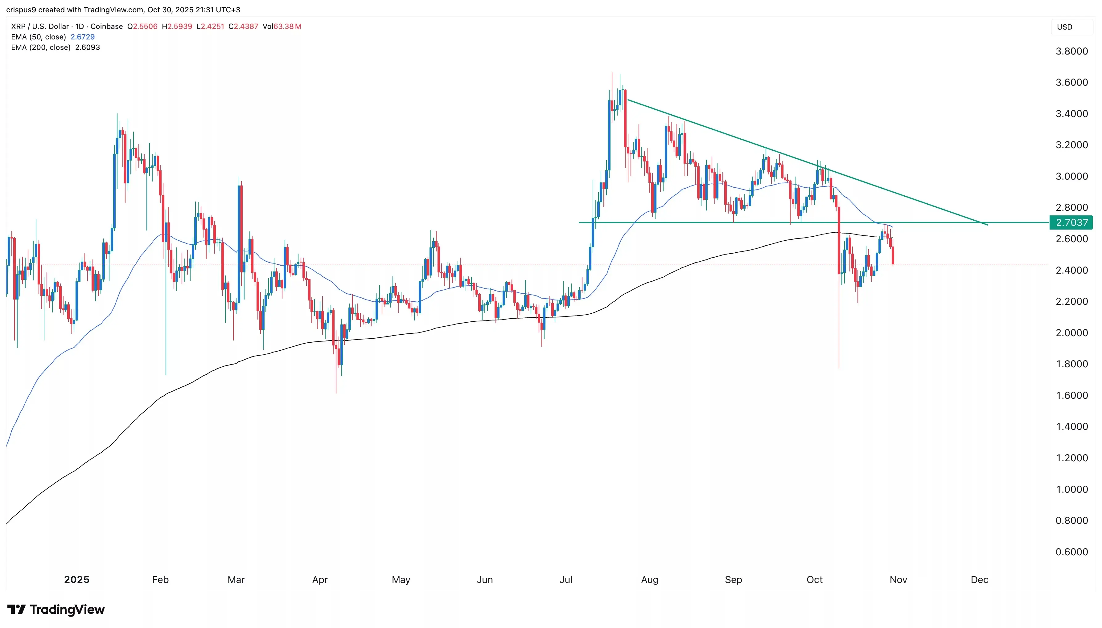در اوایل ماه جاری، ریپل شکست نزولی را تجربه کرد، همزمان با سقوط بازار رمزارزها. پس از آن، این رمزارز با الگوی break-and-retest، مجدداً به سطح ۲.۷۰ دلار بازگشت و تثبیت شد.