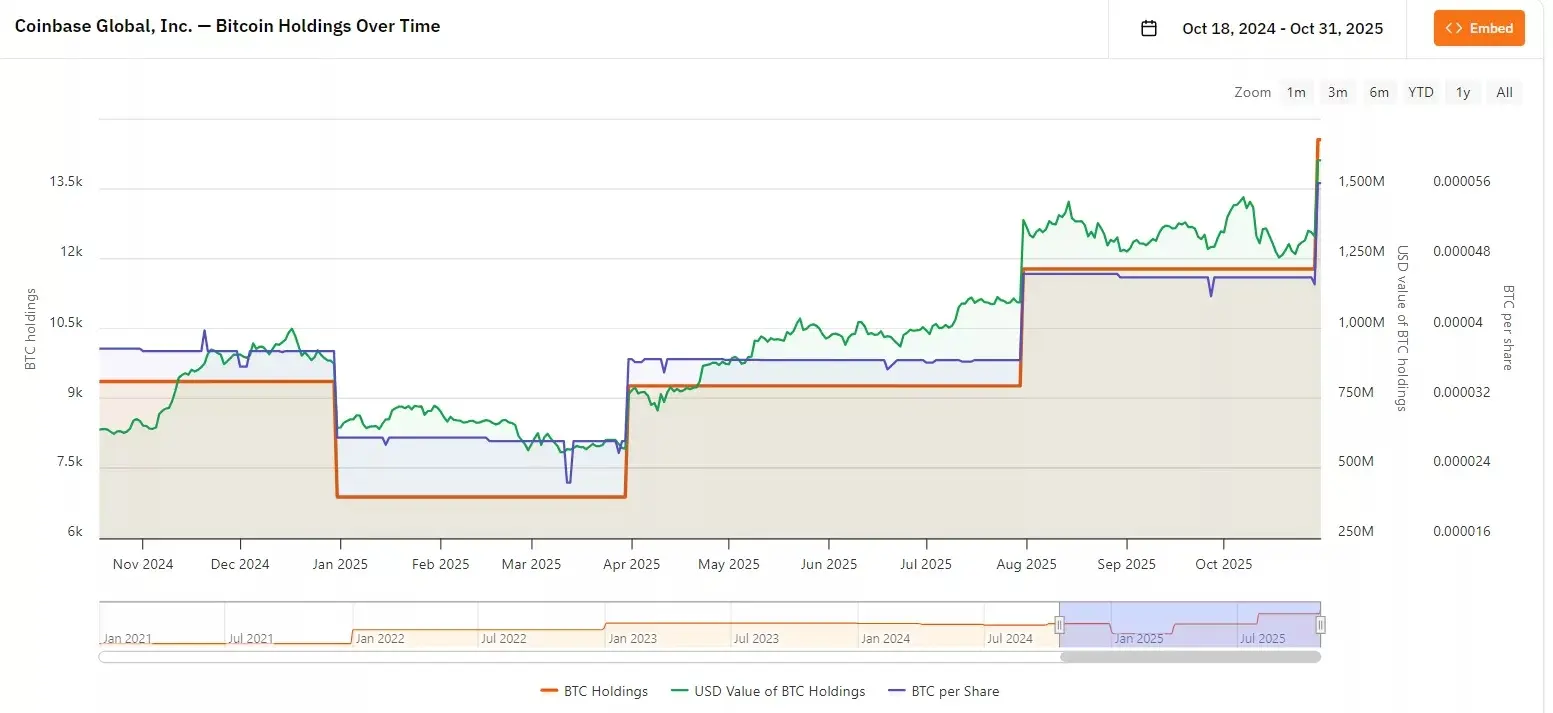 بر اساس دادههای سایت بیتکوین تریزوری (Bitcoin Treasuries)، ارزش کل بیتکوینهای نگهداریشده توسط کوینبیس پس از افزودن سهماهه سوم، از مرز ۱ میلیارد دلار عبور کرده است. برآورد میشود که در تاریخ ۳۱ اکتبر، این شرکت حدود ۱۴۵۴۸ بیتکوین در ترازنامه خود دارد که ارزش آن با توجه به قیمتهای جاری بازار حدود ۱.۶ میلیارد دلار برآورد میشود.