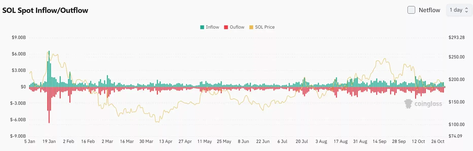 در عین حال، دادههای صرافیها نشان میدهد که پس از هفتهها ثبات نسبی، میزان خروج سرمایه از این رمزارز افزایش یافته است. بر این اساس، تعداد توکنهای سولانا در حال حاضر بیشتر در حال انتقال به صرافیها است تا در کیف پولهای سرد یا نگهداری توسط کاربران در شبکه، باقی بماند. در روز ۳۱ اکتبر، صرافیهای بزرگ مانند بایننس، اوکیاکس، کوینبیس و بایبیت شاهد افزایش خروجیهای سولانا بودهاند.