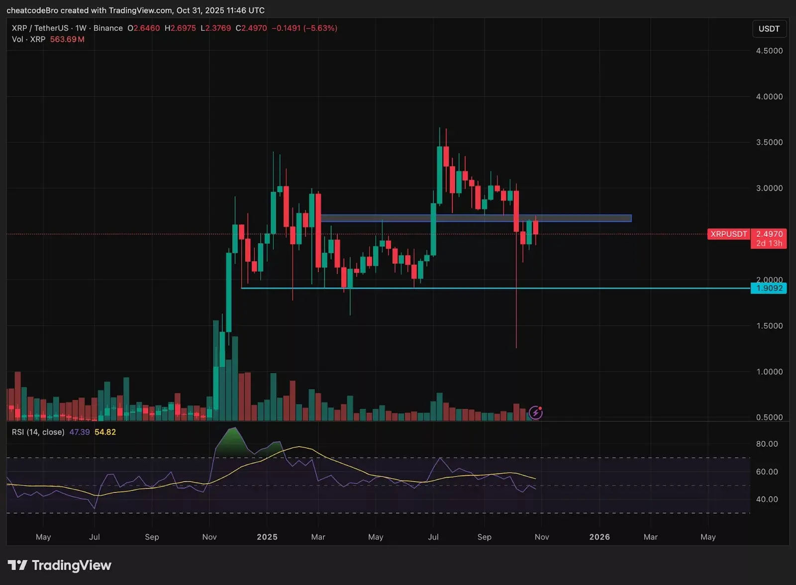 مقاومت ۲.۷۰ دلار در تحلیل قیمت ریپل (ایکسآرپی) همواره نقش خطپیدا و برگشتپذیری را ایفا کرده است. در طول سال جاری، هر بار که قیمت قصد عبور از این سطح را داشت، با واکنش منفی شدیدی مواجه شد و روند صعودی کوتاهمدتی را تجربه نکرده است. این مقاومت قوی باعث شده است که هر تلاش برای شکست آن منجر به رد قوی و کاهش قیمت به زیر ۲ دلار شود، که در نتیجه، انگیزههای خریداران را تضعیف کرده و روندهای صعودی را محدود میکند.
