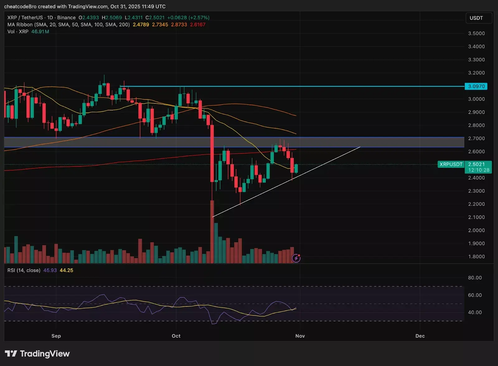 براساس دادههای بازار، قیمت ریپل در حال حاضر در حدود ۲.۵۰ دلار معامله میشود، که نسبت به روز قبل کاهش ۲.۱ درصدی را نشان میدهد، اما در طول هفته جاری با رشد ۱.۹ درصدی همراه بوده است. این توکن در بیشتر ماه اکتبر در محدوده زیر ۲.۷۰ دلار تثبیت شده و روند تثبیت و جمعبندی را در قالب تشکیل کفها و سقفهای بالاتر طی سه هفته گذشته طی کرده است. مقاومت ۲.۷۰ دلاری هنوز شکسته نشده است، اما انتظار میرود امیدواریها نسبت به تصویب ETFهای مرتبط با ریپل، در صورت ادامه روند مثبت، بتواند قیمت این توکن را به سمت عبور از این سطح هدایت کند.