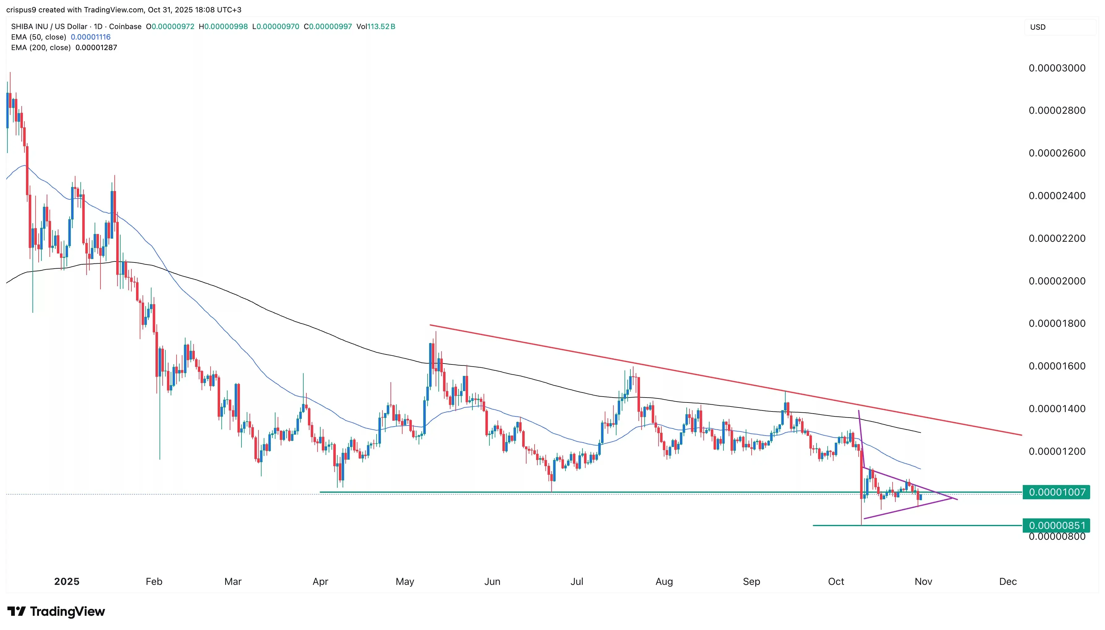 در نمودار، شیبا اینو یک الگوی مثلث نزولی (descending triangle) تشکیل داده است که یکی از الگوهای رایج در ادامهدار بودن روندهای کاهشی محسوب میشود. این رمزارز در حال حاضر در کنار خط پایینی این الگو قرار دارد و فشار فروش در بازار همچنان بالا است.