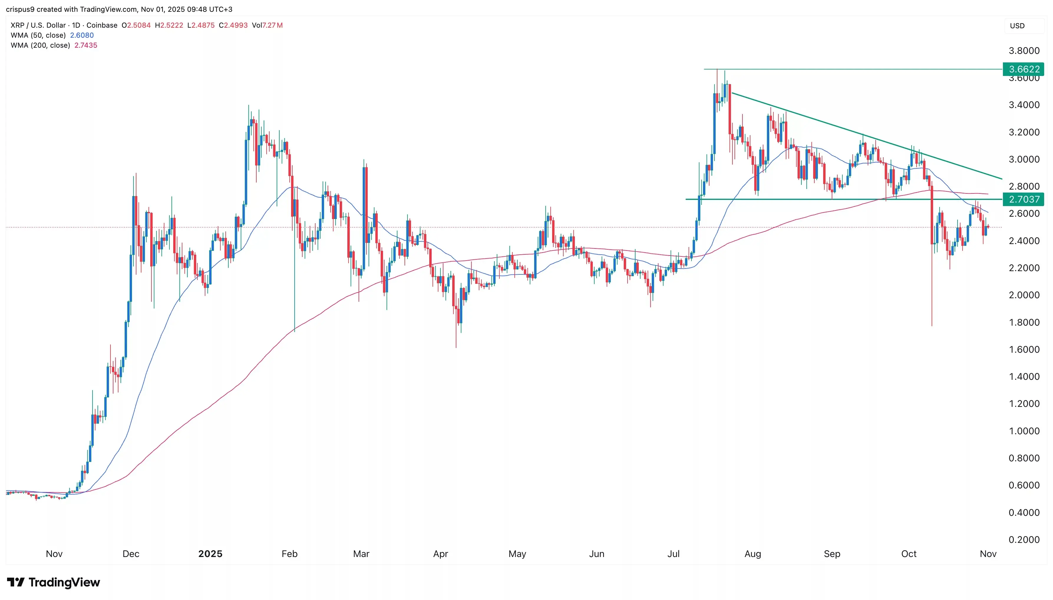 نمودار روزانه نشان میدهد که قیمت ریپل (XRP) در ماههای اخیر کاهش یافته است. این روند نزولی پس از ثبت رکورد قیمتی ۳.۶۶ دلار در آگوست آغاز شد و در ماه اکتبر شدت گرفت.