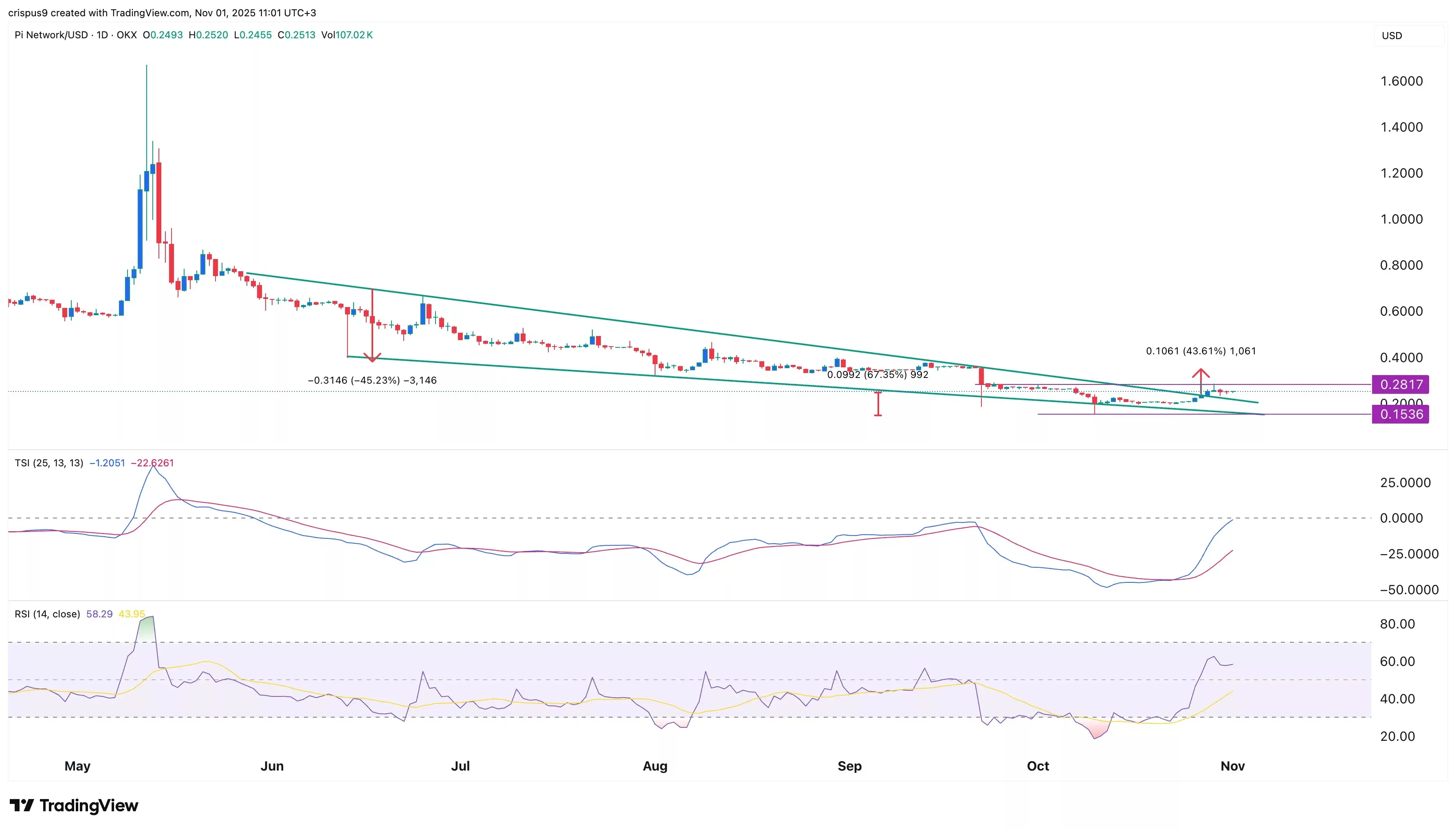 در نمودار روزانه، شاهد بهبود قابل توجه در ارزش رمزارز پی (Pi) در چند روز اخیر هستیم. این رمزارز از سطح قیمتی ۰.۱۵۳۵ دلار به ۰.۲۵۱۵ دلار رسیده است، که نشاندهنده روند صعودی مجدد است. این حرکت مثبت پس از شکلگیری الگوی wedge نزولی (مثلث کاهشی) صورت گرفته است، که از دو خط روند همگرا و نزولی تشکیل شده است.