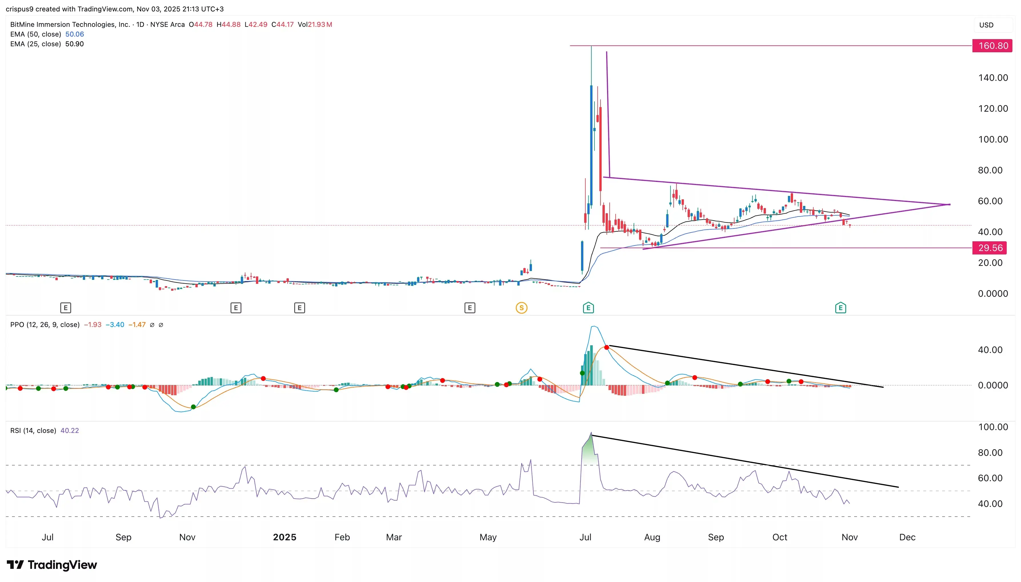 نمودار تایمفریم روزانه نشان میدهد قیمت سهام بیتماین (BitMine) در چند ماه اخیر روند نزولی قابلتوجهی داشته است. این سهم از قله ۱۶۰ دلار در تیرماه، هماکنون به حدود ۴۴ دلار کاهش یافته است.