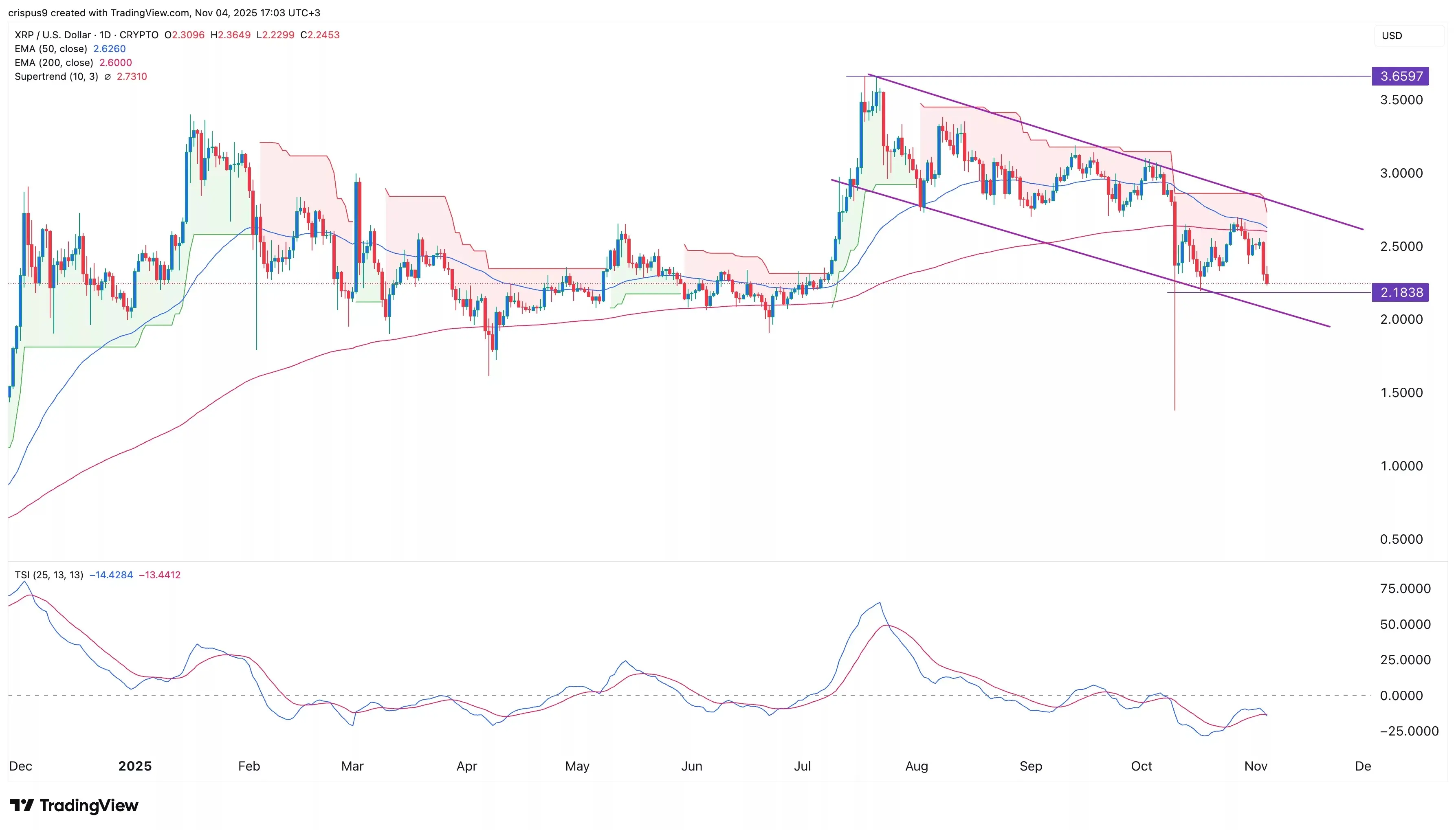 علاوه بر این، شاخص Supertrend نیز نشانگر نزول قیمت است و خطوط شاخص True Strength Index (شاخص قدرت واقعی) جهت کاهش را نشان میدهند. تمامی این عوامل حاکی از ادامه روند کاهش قیمت ریپل است، که ممکن است تا سطح حمایت کلیدی در حدود ۲ دلار ادامه یابد.