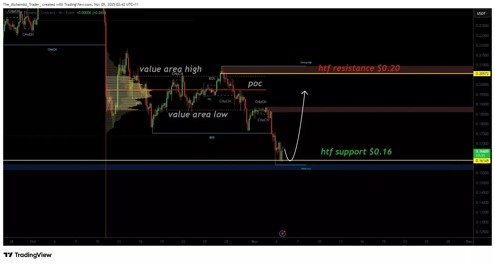 در نمودارهای تایمفریم پایینتر، واکنشهای اولیه صعودی مشاهده میشود؛ با تشکیل ویکهای پیدرپی در بالای حمایت ۰.۱۶ دلار که معمولاً نشاندهنده بازگشت تقاضا پس از فروش شدید است. شدت حرکت نزولی اخیر و همچنین وضعیت اشباع فروش در شاخصهایی مانند RSI، احتمال وقوع یک رالی فنی موقت را قوت میبخشد.