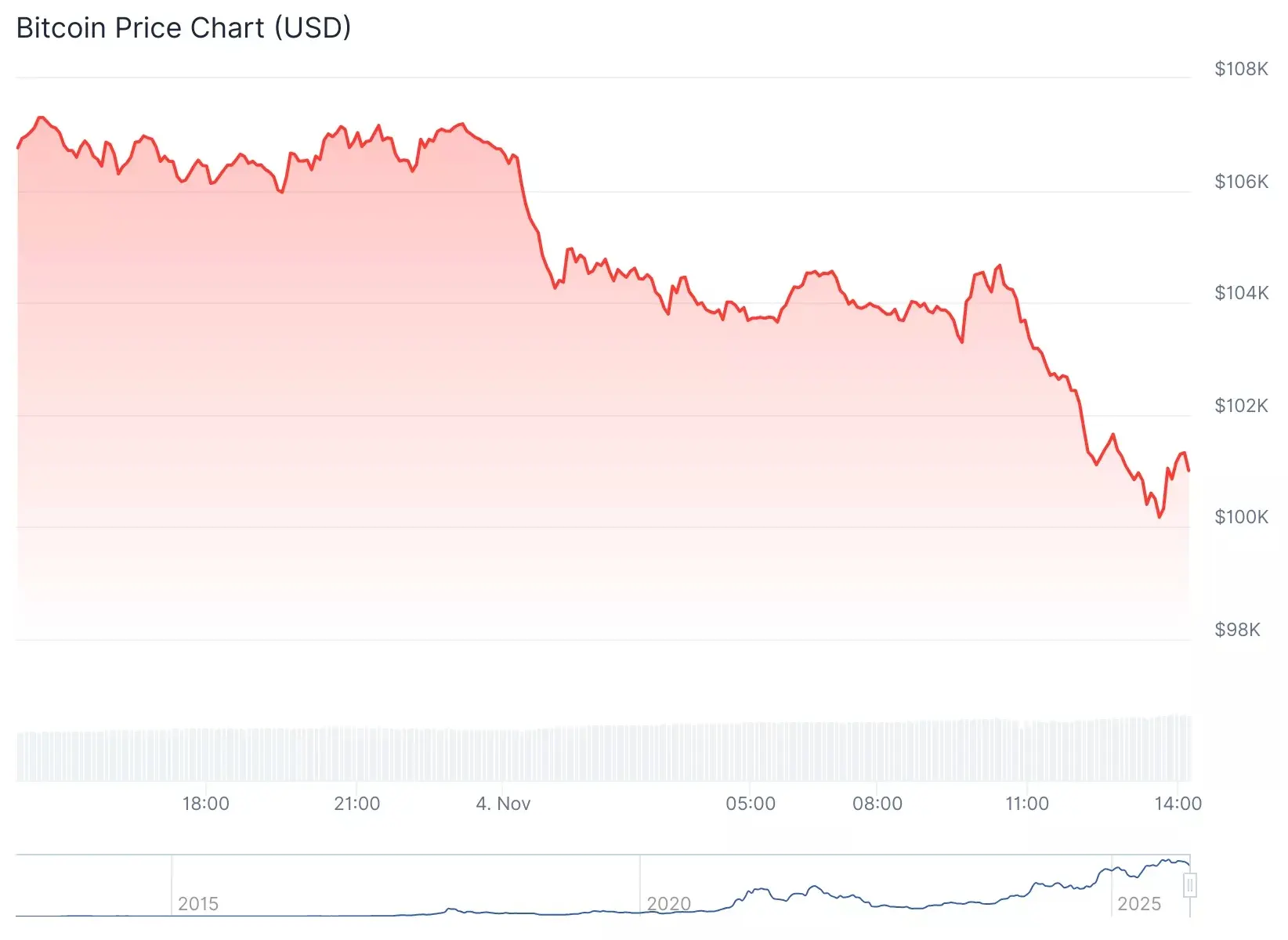 قیمت بیتکوین (Bitcoin) پس از مدتها، به زیر سطح حمایتی مهم ۱۰۵ هزار دلار سقوط کرد و در نهایت به رقم ۹۹ هزار و ۹۵۴ دلار رسید. این کاهش قیمت در پی خروج قابل توجه سرمایهها از صندوقهای قابل معامله در بورس (ETF) و افزایش چشمگیر در میزان لیکوئید شدن پوزیشنها رخ داد. نمودار مربوطه در زیر قابل مشاهده است.