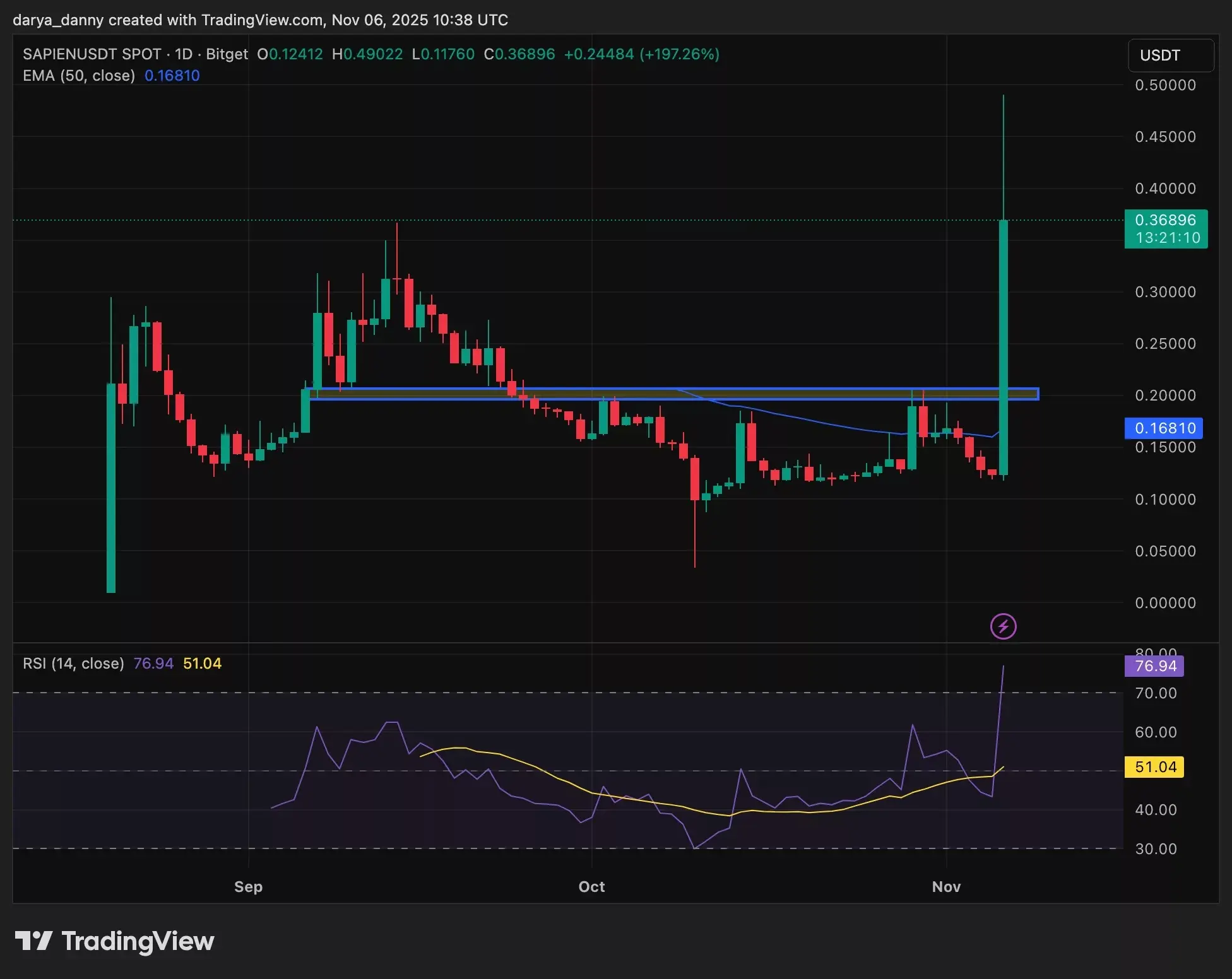 در پی اعلام رسمی و قرارگیری در برنامه HODLer Airdrop باینانس، قیمت توکن ساپین (SAPIEN) در ۲۴ ساعت گذشته بیش از ۱۰۰ درصد رشد کرد. این پروژه که در فهرست ۵۷امین پروژه قرار گرفته، پس از اعلام لیست شدن در باینانس، توجه قابلتوجهی را به خود جلب کرد.
