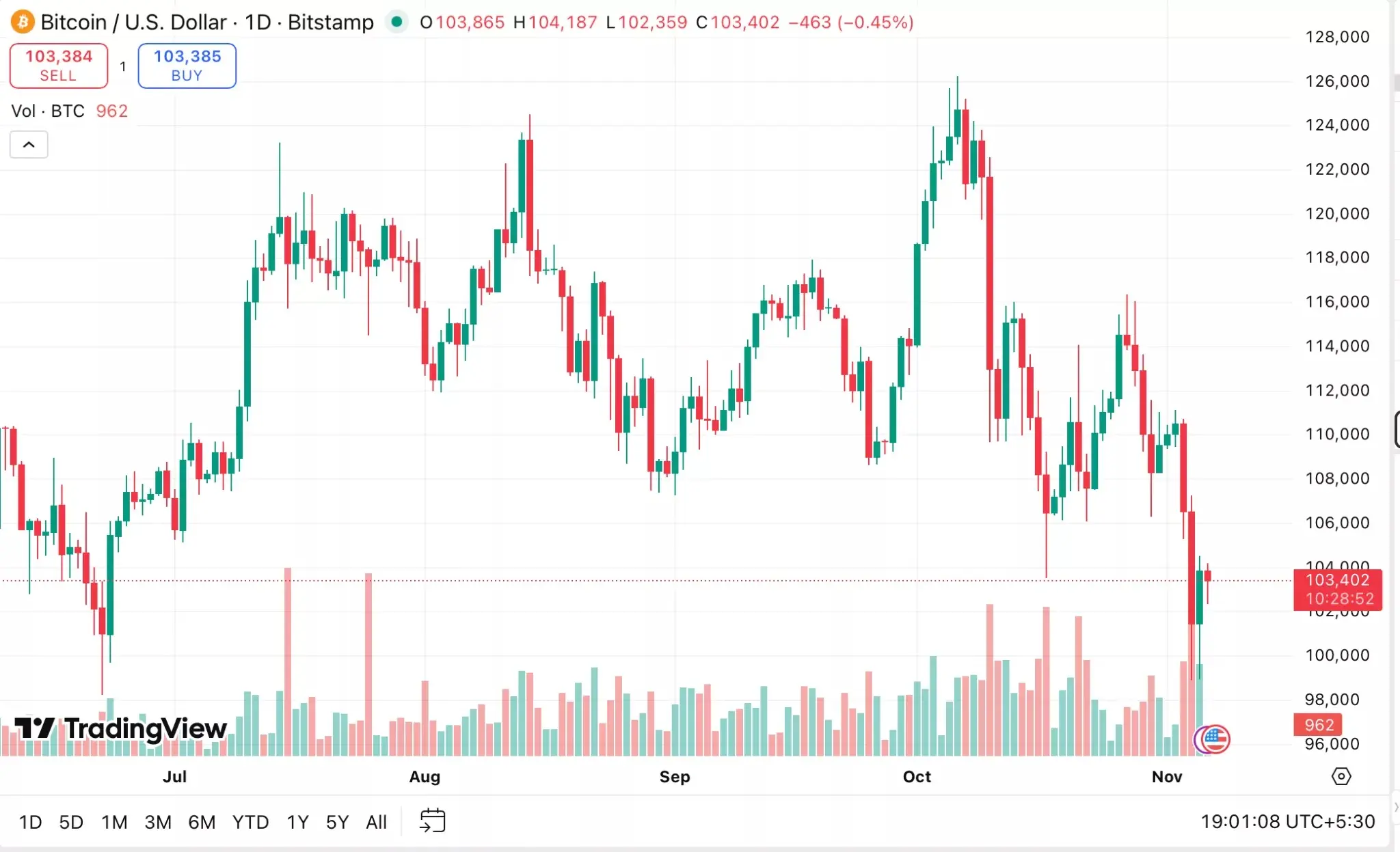 این روندهای احتیاطی و نزولی در بازارهای مالی، فضای نگرانی را در سایر بازارهای سوداگرانه نیز گسترده کرده است. بازار رمزارزها، که اغلب رفتارهای آنها همراستا با سهام فناوری است، در هفتههای اخیر شاهد کاهشهای قابل توجهی بوده است. ارزش کل بازار رمزارزها از حدود ۴.۲ تریلیون دلار در ۶ اکتبر به حدود ۳.۴۳ تریلیون دلار در یک ماه بعد، معادل کاهش ۱۸ درصد، رسیده است. بیتکوین (Bitcoin) تنها در این مدت نزدیک به ۱۹ درصد کاهش یافته و از ۱۲۶ هزار دلار به حدود ۱۰۳ هزار دلار رسیده است، که یکی از بزرگترین کاهشهای ماهانه در سالهای اخیر محسوب میشود.
