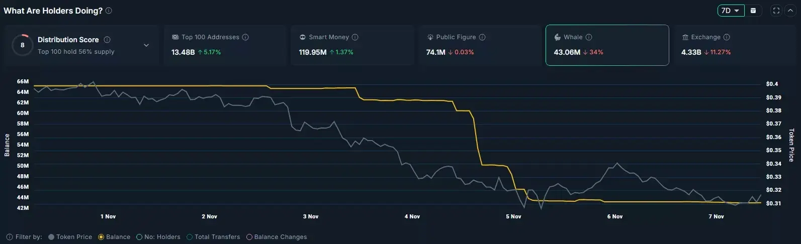 همزمان، دادههای نانس (Nansen) نشان میدهد که سرمایهگذاران بزرگ یا همان "نهنگها" نقش مهمی در روند نزولی اتنا ایفا کردهاند. موجودی توکنهای در اختیار نهنگها از ۶۵.۲۴ میلیون در ۳۱ اکتبر به ۴۳.۰۶ میلیون در زمان نگارش این گزارش کاهش یافته است. فروشهای سنگین نهنگها غالباً باعث ایجاد ترس و واکنشهای منفی در میان سرمایهگذاران خرد میشود و فشار فروش را تشدید میکند.