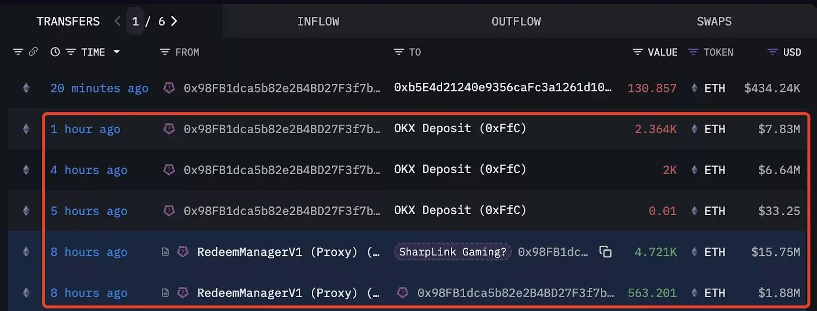 شرکت سرمایهگذاری در حوزه فناوری بلاکچین و رمزارز، شارپلینک گیمینگ (SharpLink Gaming)، به تازگی بیش از ۱۴ میلیون دلار اتریوم (ETH) را به صرافی کریپتو اوکاکس (OKX) منتقل کرده است. این اقدام در آستانه برگزاری گزارش سهماهه مالی شرکت انجام شده است.
