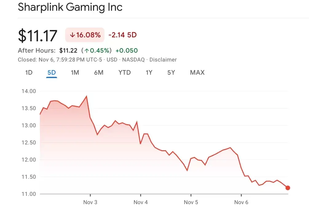 در تاریخ ۷ نوامبر، سهام شرک لینک (نماد SBET) بیش از ۸ درصد کاهش یافته و در طول یک هفته بیش از ۱۲ درصد افت کرده است. در بازه ماهانه، این کاهشها شدت بیشتری یافته و بیش از ۳۷ درصد است.