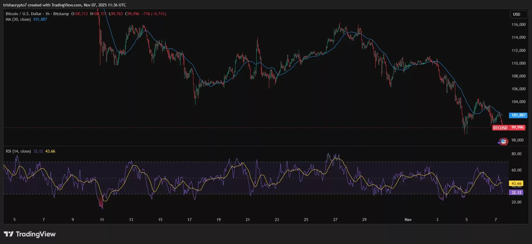 در روز گذشته، بیتکوین حدود ۳.۱۱ درصد کاهش یافته و در هفت روز گذشته، در مجموع حدود ۹ درصد افت داشته است. براساس دادههای پلتفرم TradingView، میانگین متحرک ۳۰ روزه این رمزارز به شدت روند نزولی گرفته و در حال حاضر در حدود ۱۰۱ هزار و ۸۸۷ دلار قرار دارد، که نشاندهنده کنترل بازار در دست فروشندگان در کوتاهمدت است.