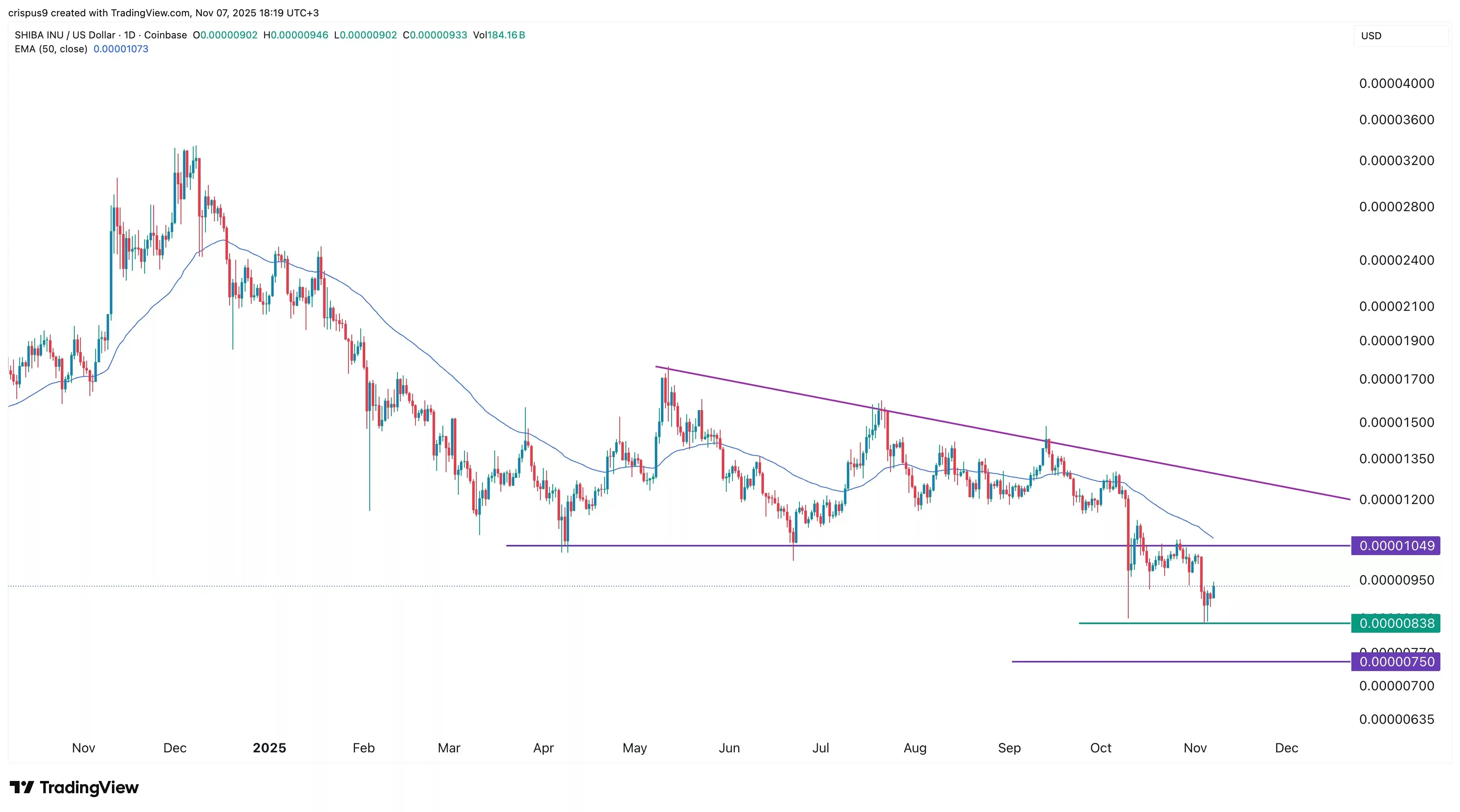 در نمودار تایمفریم روزانه، روند قیمت شیبا اینو (Shiba Inu) در ماه جاری نشاندهنده فشار فروش قابلتوجه است. قیمت این رمزارز تمامی میانگینهای متحرک را زیر پا گذاشته و الگوی مثلث نزولی (descending triangle) را تشکیل داده است، که یکی از نشانههای رایج ادامهدار بودن روند نزولی به شمار میرود.