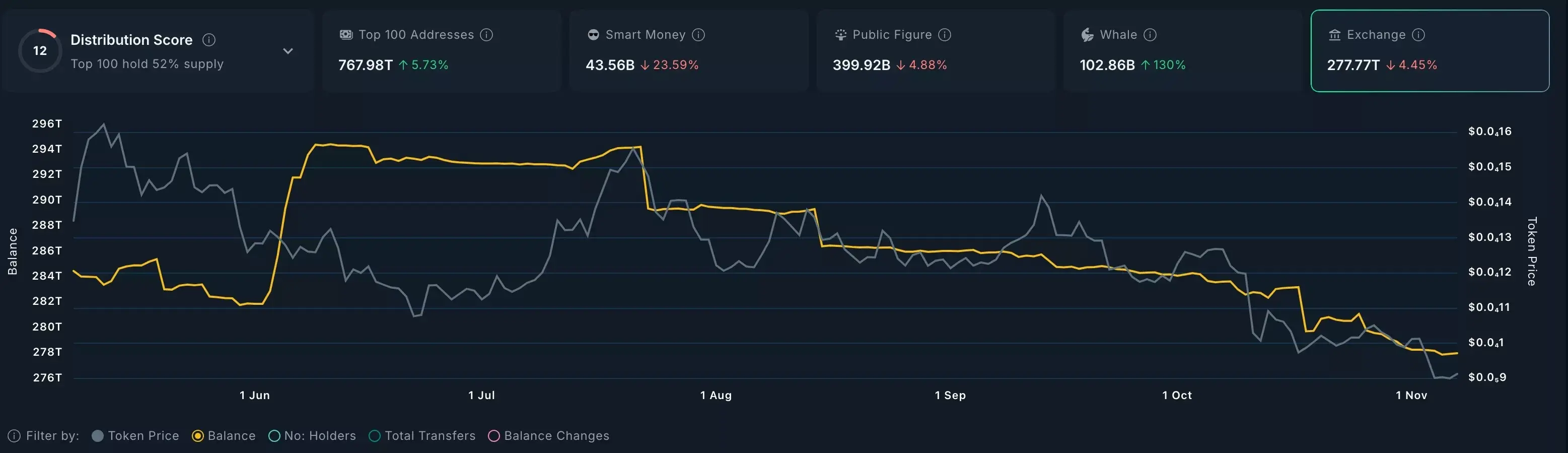 علاوه بر این، افراد و سرمایهگذاران شناختهشده و به اصطلاح «هوشمند» نیز مواضع خود در این رمزارز را کاهش دادهاند. سرمایهگذاران حرفهای، حدود 43 میلیارد توکن در اختیار دارند، در حالی که سرمایهگذاران عمومی این رقم را به 399 میلیارد توکن کاهش دادهاند؛ کاهشهایی به ترتیب 23 درصد و 4.8 درصد در 30 روز گذشته.