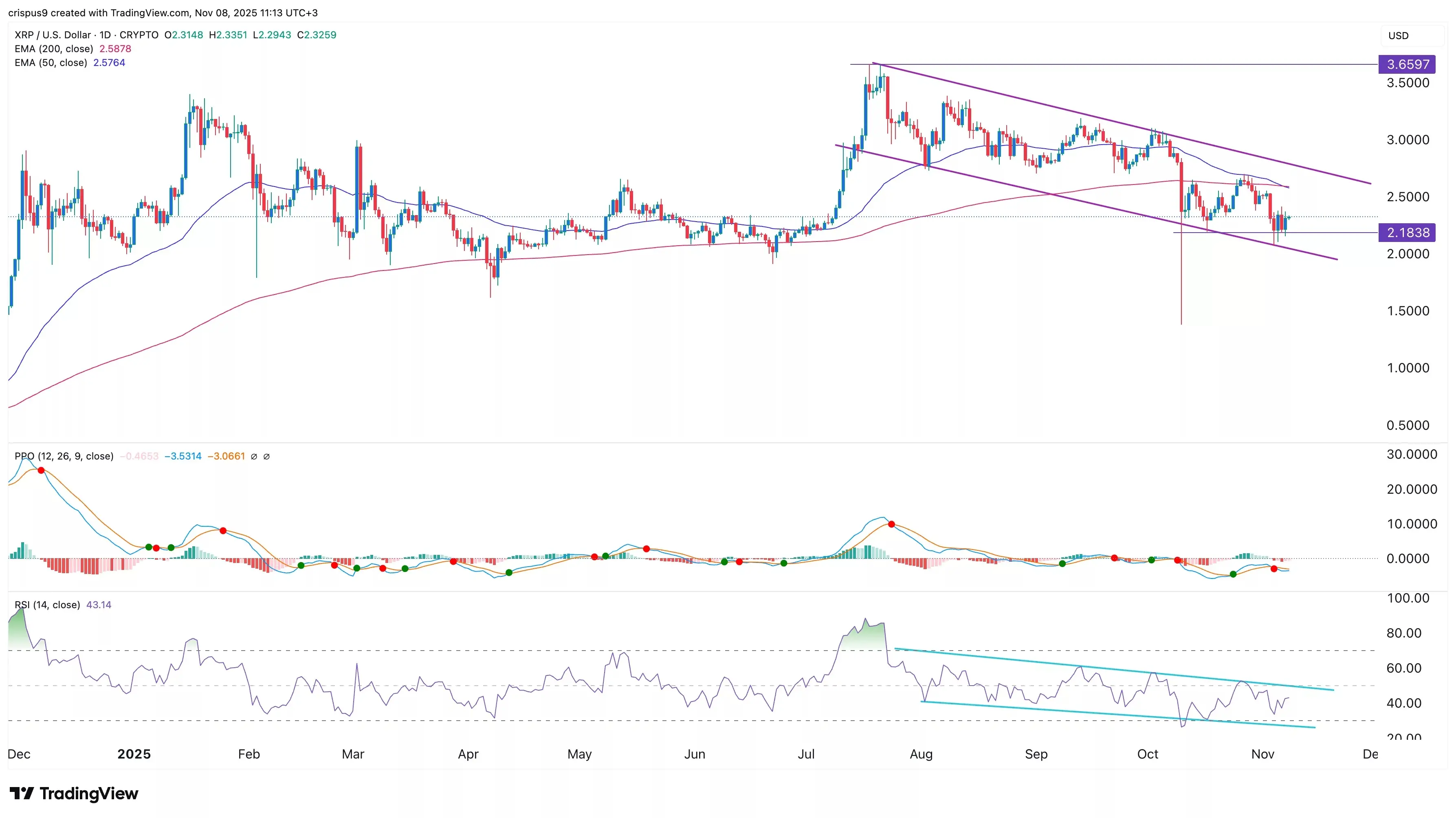 در طرف مقابل، الگوی دو کف (Double Bottom) در سطح قیمت ۲.۱۸۳۸ دلار تشکیل شده است و خط گردن این الگو در حدود ۲.۶۸ دلار قرار دارد. علاوه بر این، شاخص قدرت نسبی (RSI) و نوسانگر درصدی قیمت (PPO) نشاندهنده واگرایی صعودی هستند، که میتواند خبر از احتمال رشد قیمت رمزارز در آینده نزدیک بدهد.