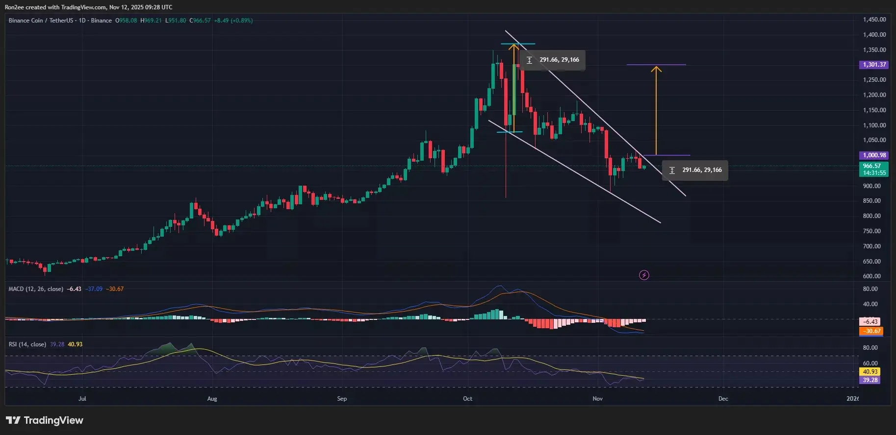 نمودار روزانه نشان میدهد که قیمت بایننس کوین (BNB) در بیشتر روزهای پس از کاهش از بالاترین سطح اکتبر، روند نزولی خود را حفظ کرده است. در این مسیر، الگوی فنجانی نزولی یا همان falling wedge شکل گرفته است که در تحلیلهای تکنیکال به عنوان یک الگوی بازگشتی کاهشی شناخته میشود. این الگو معمولاً نشاندهنده ادامه روند نزولی یا احتمال اصلاح قیمتی در آینده نزدیک است.