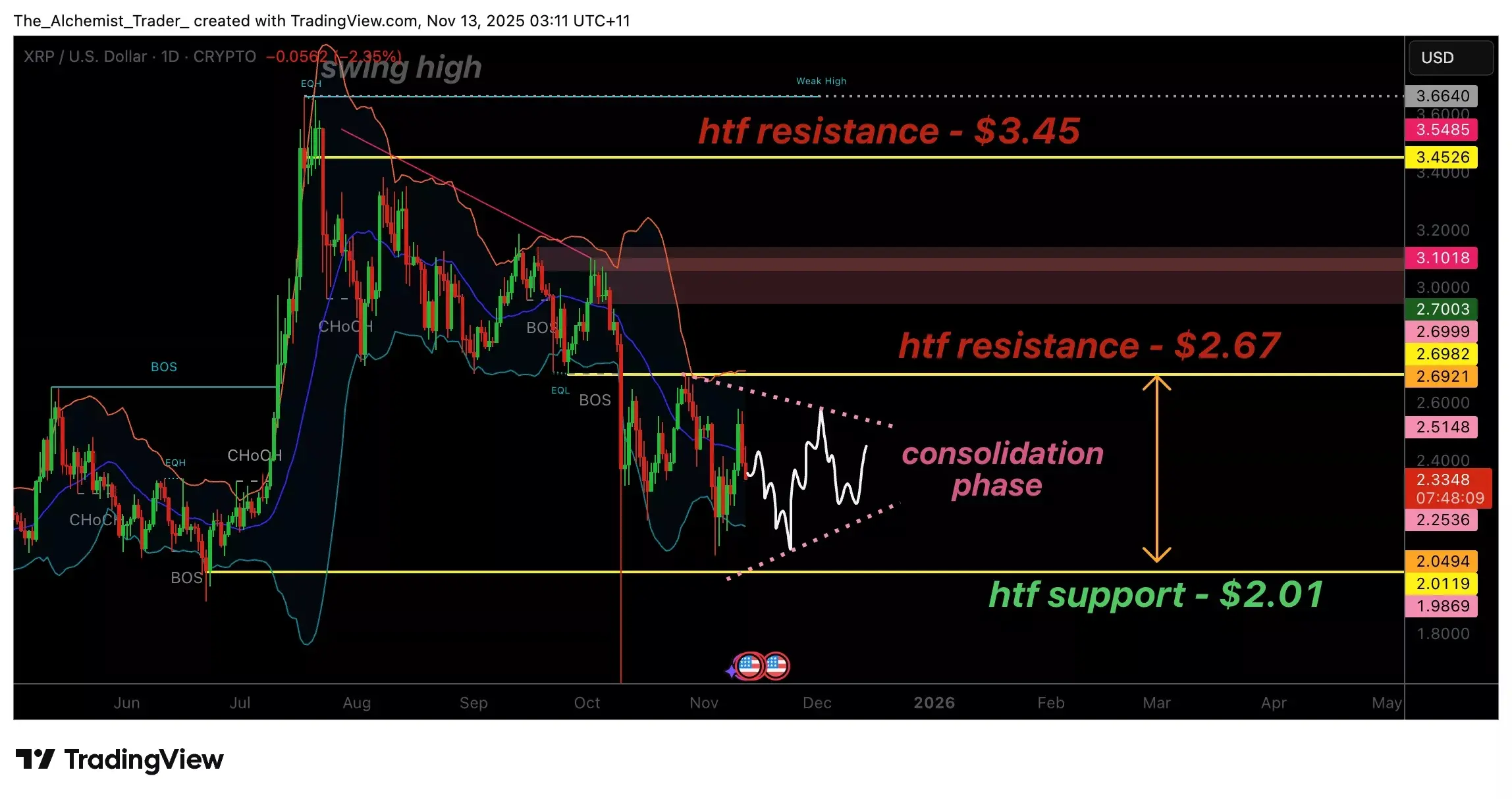 حمایت ۲ دلار برای ریپل (XRP) نقش حیاتی ایفا میکند، بهطوری که چندین کندل روزانه در بالای این سطح بسته شده است، نشاندهنده تمایل قوی خریداران است. با این حال، مقاومت نزدیک به ۲.۶۷ دلار بارها مانع از ادامه رشد قیمت شده و نشان میدهد فروشندگان در سطوح بالاتر فعال هستند. این تقابل میان دو محدوده، دامنه نوسان مشخصی را شکل داده است که هنوز به صورت قطعی حلوفصل نشده است.