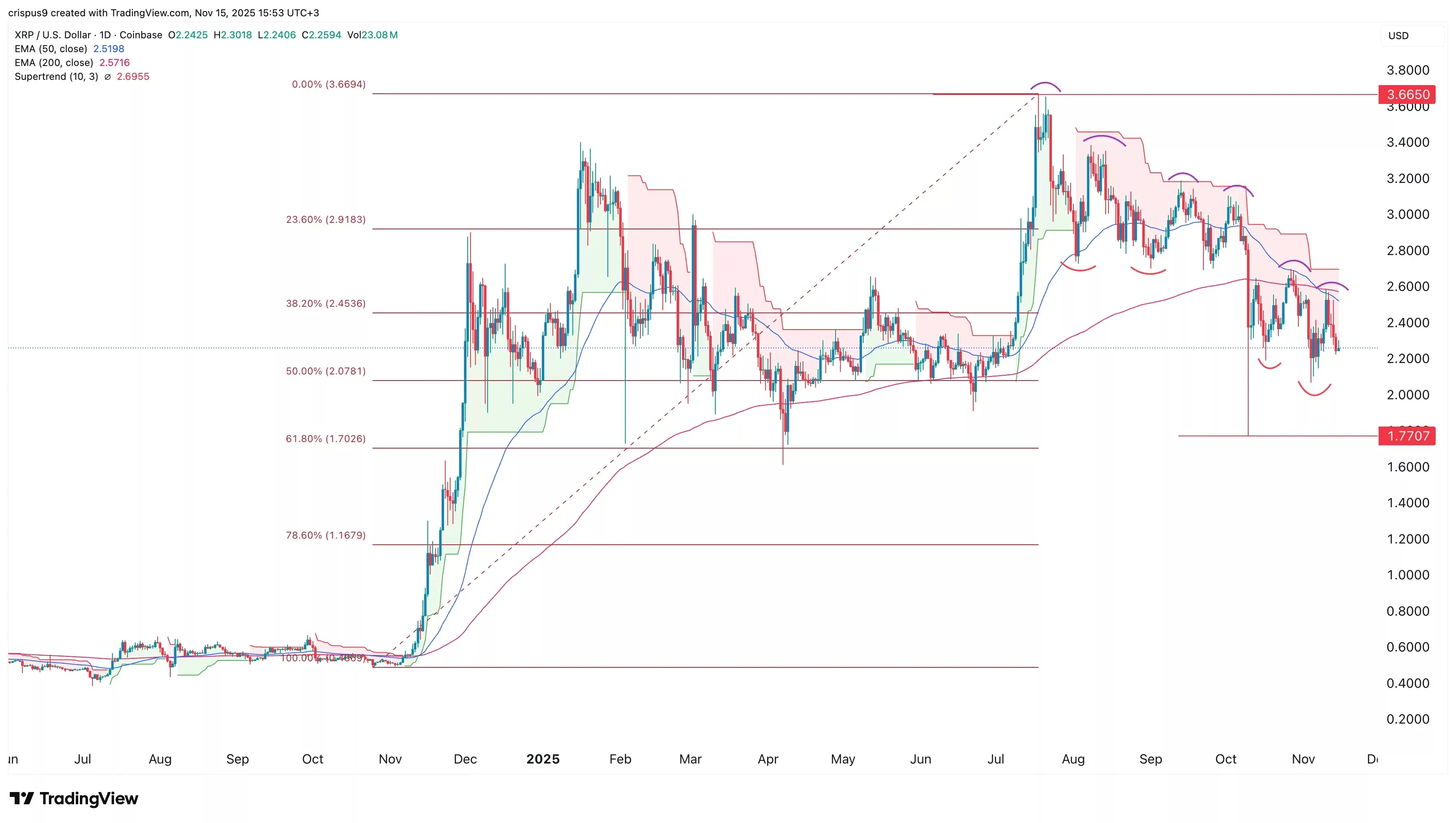 نمودار تایمفریم روزانه نشان میدهد که قیمت ریپل (Ripple) پس از ثبت اوج تاریخی در سطح ۳.۶۶۵۰ دلار در ماه اوت، وارد روند نزولی شده است. در این مسیر، قیمت تشکیل سلسلهای از پایینترین و بالاترینهای پایینتر را ثبت کرده است که نشاندهنده مقاومت قوی در برابر هر ریکاوری است.