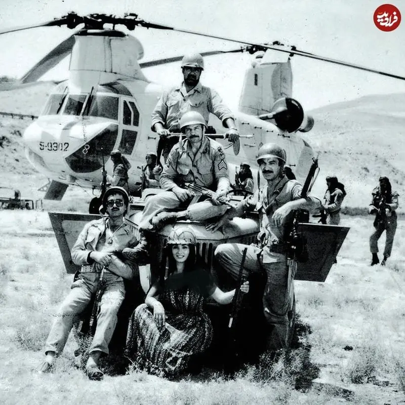 عکس نادر از ستارگان سینمای ایران در کنار هلیکوپتر شینوک هوانیروز در پشتصحنه فیلم تپه ۳۰۳ سال ۱۳۵۶