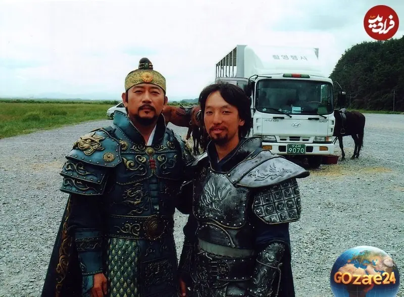 در این تصویر کمتر دیده شده، جون کوانگ ریول، بازیگر معروف کرهای که در ایران بیشتر با نقش «گوموآ» در سریال تاریخی و محبوب جومونگ شناخته میشود، در پشت صحنه این مجموعه حضور دارد. او در کنار یکی از بازیگران فرعی ایستاده و پشت سرشان کامیون مخصوص حمل اسبها قرار گرفته است؛ بخشی از فرآیند تولید عظیم که معمولاً کمتر مورد توجه تماشاگران عادی قرار میگیرد.