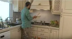 در تصویری از دکوراسیون منزل مهدی پاکدل، آشپزخانه و ناهارخوری به رنگ سفید کرمی دیده میشود. طراحی آشپزخانه به سبک نئوکلاسیک است و در بخشهایی از کابینتها، ویترینی به کار رفته است. روبروی این آشپزخانه، میز کنسول با آینهای چندبخشی قرار دارد که رنگ آن با تنالیته رنگهای کابینتها و کاغذ دیواری هماهنگ است. میز ناهارخوری کنار اپن آشپزخانه قرار گرفته است، که دسترسی به وسایل پذیرایی را آسانتر میکند. صندلیهای غذاخوری به رنگ آبی هستند، که دکور این قسمت از خانه را از یکنواختی خارج کرده و تنوع بخشیده است.