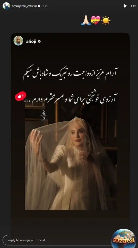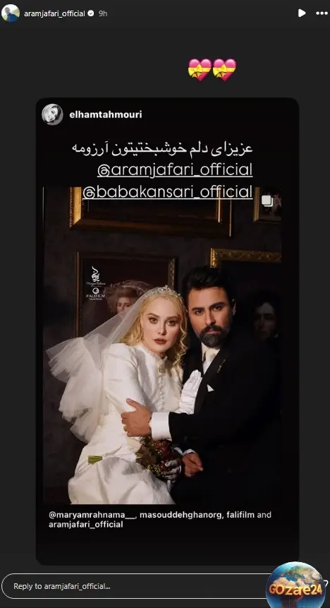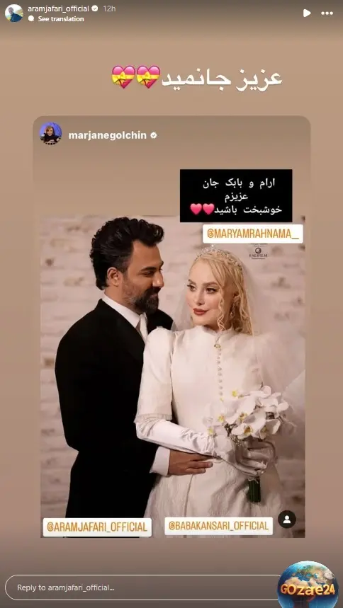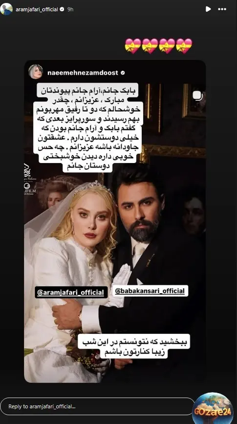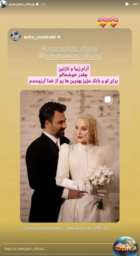 عروسی هنرمندان ایرانی در سال ۱۴۰۲؛ تبریکهای سلبریتیها به آرام جعفری و بابک انصاری + تصاویر