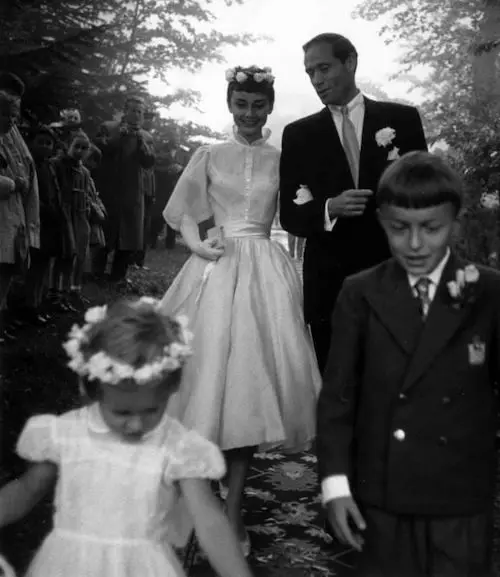 در سال ۱۹۴۵، آدری هپبورن در مراسم ازدواج خود با مل فرر، بازیگر، لباسی ساده و بدون تزیینات مد روز بر تن داشت: پیراهنی با دامن گشاد تا زیر زانو، کمربند باریک ساتن و یقه بسته. طراحی این لباس توسط پیر بالمَن، طراح فرانسوی، با آستینهای پفدار و دستکشهای بلند ابریشمی، الهامگرفته از سبک ویکتوریایی بود. تاج کوچک گلی بر روی موهای جمع شدهاش، این استایل را به نمونهای بیزمان از سادگی و ظرافت بدل کرد.