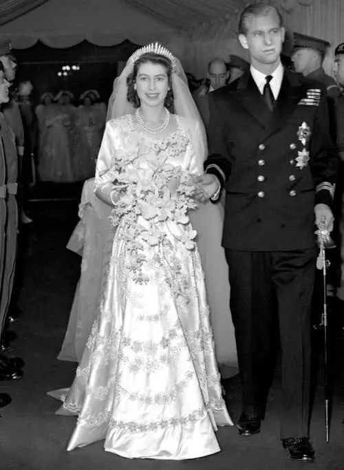 در تاریخ ۲۰ نوامبر ۱۹۴۷، ملکه الیزابت دوم با شاهزاده فیلیپ در مراسمی در وستمینستر ابی ازدواج کرد. لباس عروس او توسط نورمن هارتنل طراحی شده بود و از ساتن دوشس ساخته شده بود، با گلدوزیهای پیچیده و ظریف. هزینه ساخت این لباس در آن زمان حدود ۴۲ هزار دلار بود که معادل ۱.۶ میلیون دلار در ارزش امروز است. تور بلند و جواهرات سلطنتی به همراه این لباس، جلوهای باشکوه و بینظیر به این رویداد تاریخی بخشیدند. این مراسم نه تنها یک عروسی، بلکه نمادی از قدرت و سنتهای دیرینه سلطنتی بریتانیا محسوب میشد.