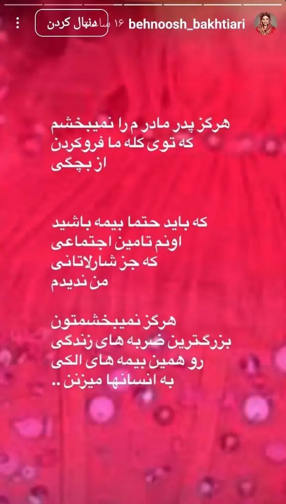 بهنوش بختیاری از دردهای عمیق کودکی میگوید؛ پدر و مادرش بزرگترین ضربههای زندگیاش را زدهاند و هرگز نمیبخشدشان.