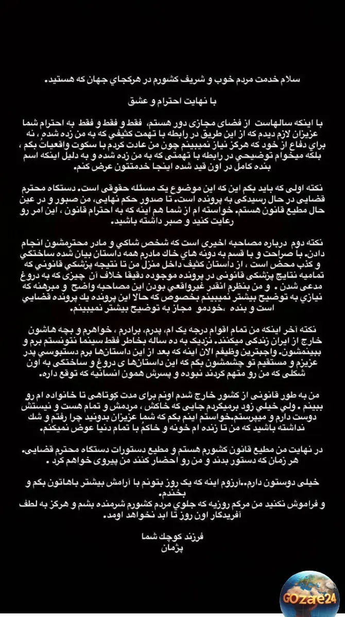 در این استوری، او با احترام و محبت به مردم کشورش در هر نقطهای از جهان، پیام خود را ابراز کرده است. وی اعلام میکند که مدتهاست از فضای مجازی دور است، اما به احترام هواداران، تصمیم گرفته است درباره تهمتی که به او وارد شده، توضیح دهد. او تاکید میکند که هدفش دفاع از خود نیست، زیرا به آن نیاز ندارد، بلکه قصد دارد درباره تهمتی که کامل نامش در آن ذکر شده، شفافسازی کند.
