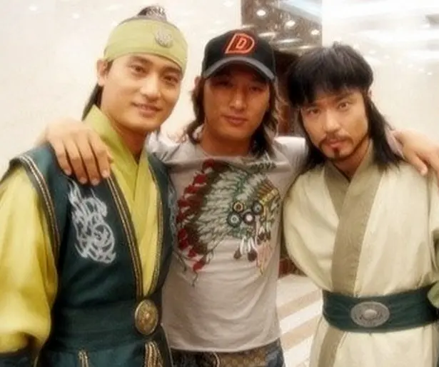 در این تصویر، پشت صحنه سریال جومونگ نشان داده شده است که در آن وون کی جون (یونگپو)، هو یو مین (اویی) و بازیگر نقش هاندانگ حضور دارند.