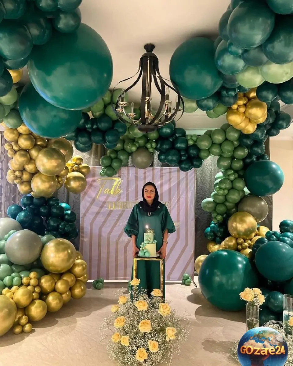 عکس جشن تولد لاکچری آزاده زارعی با تم سبز و بادکنکهای طلایی