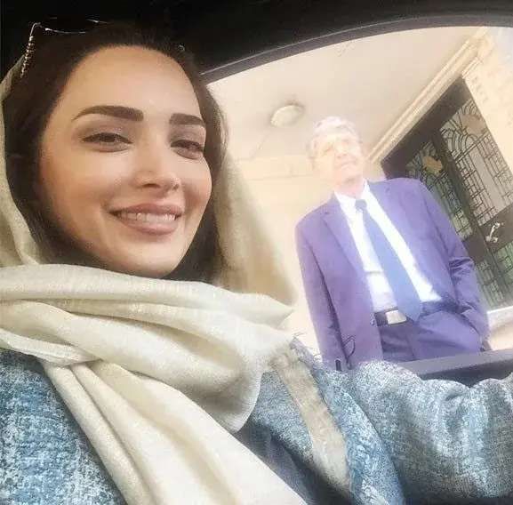 بهنوش طباطبایی در کنار پدرش ایستاده است.