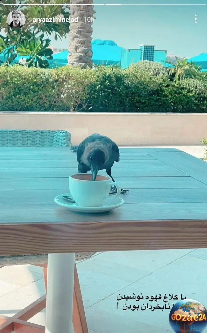 آریا عظیمینژاد با کلاغ قهوه نوشیدن و پیام کنایهآمیز درباره نابخردان بودن