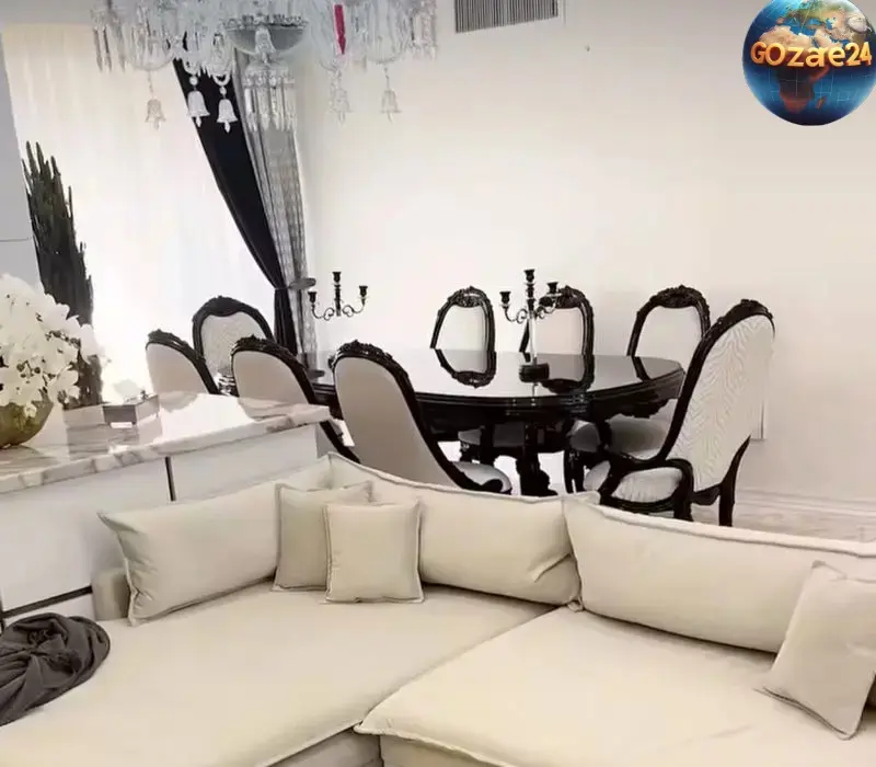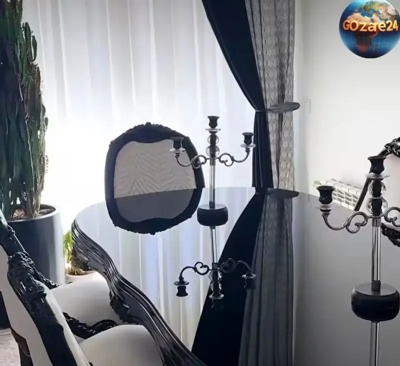 تصاویر ارائهشده نمایی از دکوراسیونی شیک و لوکس متعلق به سوسن پرور را نشان میدهد؛ فضایی که بر پایه تضاد جذاب بین رنگهای مشکی و سفید طراحی شده است. میز ناهارخوری شیشهای و مشکی همراه با صندلیهایی که با روکشهای روشن و طرحهای منبتکاری تزئین شدهاند، این فضا را رسمی و باشکوهتر کرده است. علاوه بر این، قرارگیری شمعدانهای کلاسیک روی میز و استفاده از پردههای ضخیم و چندلایه، به زیبایی و شکوه هر چه بیشتر این فضای تشریفاتی افزوده است.