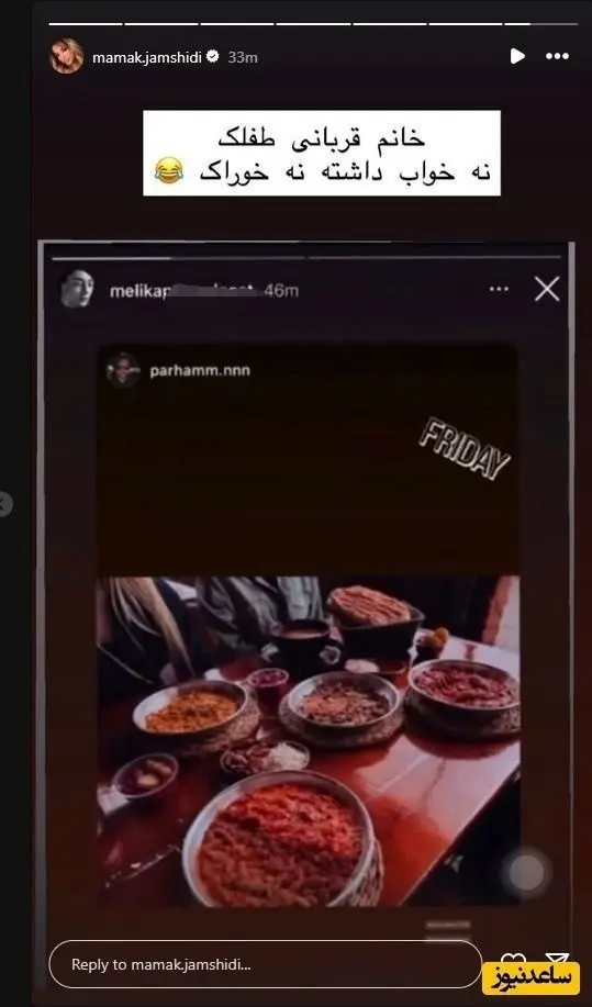 مامک جمشیدی، خواهر پژمان جمشیدی، چند استوری درباره شاکی پرونده منتشر کرده است. در یکی از این استوریها نوشته است: «خانم قربانی، طفلک نه خواب داشته نه خوراک.»