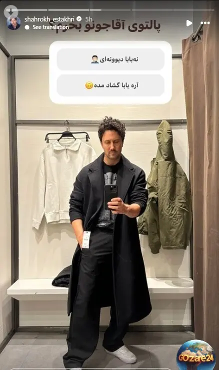 شاهرخ استخری با استایل جدید و کت گشاد بابابزرگ در اتاق پرو، نظرات طرفداران درباره تیپ متفاوت او را جویا شد.