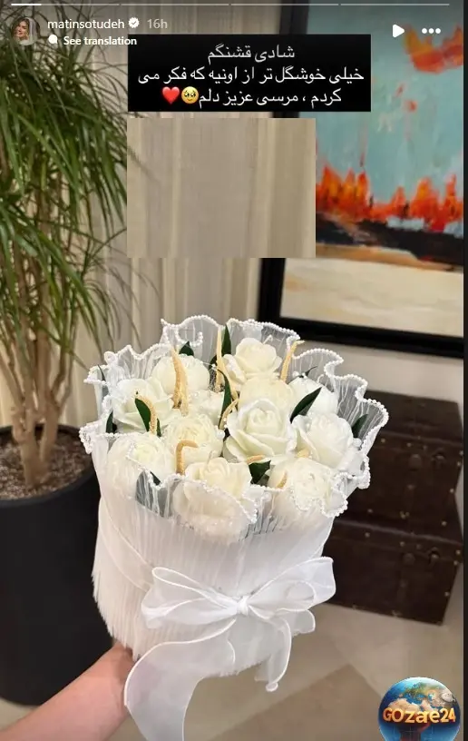 در این تصویر، بخشی از دکوراسیون منزل متین ستوده و کامران تفتی مشاهده میشود که با ترکیبی از عناصر مدرن و کلاسیک طراحی شده است. رنگهای خنثی مانند کرم و قهوهای در کف و دیوارها به کار رفته است، و حضور گیاه طبیعی در گلدانی مشکی براق فضایی آرام و دلنشین را ایجاد کرده است. تابلو نقاشی رنگارنگ بر روی دیوار، تضادی هنرمندانه با پسزمینهی آرام فضا برقرار کرده و حس پویایی و زندگی را به محیط افزوده است.