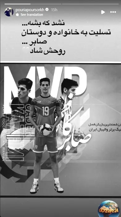 صابر کاظمی (۳ دی ۱۳۷۷ – ۱۴ آبان ۱۴۰۴) بازیکن تیم ملی والیبال مردان ایران و عضو باشگاه الریان قطر در لیگ والیبال قطر بود. وی در سوم دی ماه ۱۳۷۷ در روستای قانقرمه، از توابع شهرستان آققلا در استان گلستان به دنیا آمد. در اینجا تصاویری از واکنش بازیگران نسبت به خبر درگذشت صابر کاظمی را مشاهده میکنید.