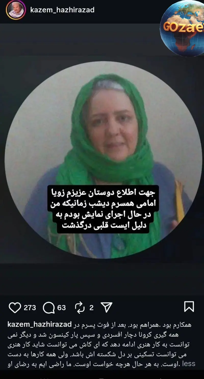 درگذشت زویا امامی، بازیگر تلویزیون و همسر کاظم هژیرآزاد، بر اثر ایست قلبی، هنرمندی با سابقه درخشان در عرصه بازیگری ایران.