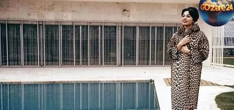 عکس نادر از فرح پهلوی در کنار استخر کاخ نیاوران با حوله سرهمی پلنگی، لحظهای خاص و دیدنی از همسر شاه ایران در فضای سلطنتی و آرامشبخش.