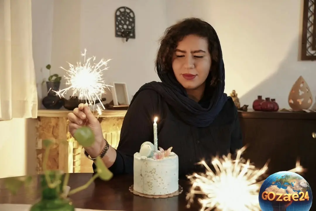 در تصویر دوم، دکوراسیون خانه حالوهوای گرم و دوستانهتری دارد. نور ملایم و رنگهای خاکی دیوارها، همراه با جزئیاتی مانند قابها و گلدانها، فضایی آرام و دلپذیر را ایجاد کرده است. کیک کوچک و شمع روشن در کنار درخشش فشفشهها، حس شادی، جشن و لحظههای خصوصی را به محیط میافزایند. در مجموع، چیدمان منزل صهبا ترکیبی است از سادگی، اصالت ایرانی و گرمای خانگی.