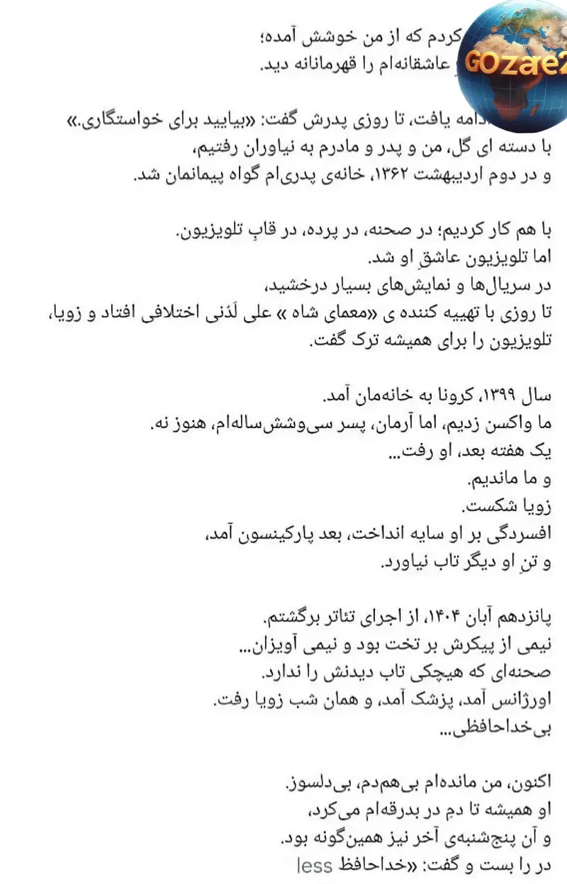 پانزدهم آبان ۱۴۰۴، از اجرای تئاتر برگشتم، نیمی از پیکرش بر تخت بود و نیمی آویزان...